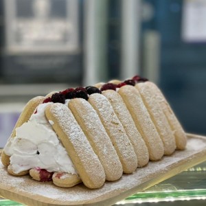 Layers of Vanilla Sponge cake, Crème Chantilly, Fior di latte Gelato, Strawberries and a touch of gold leave all topped with slivered white chocolate