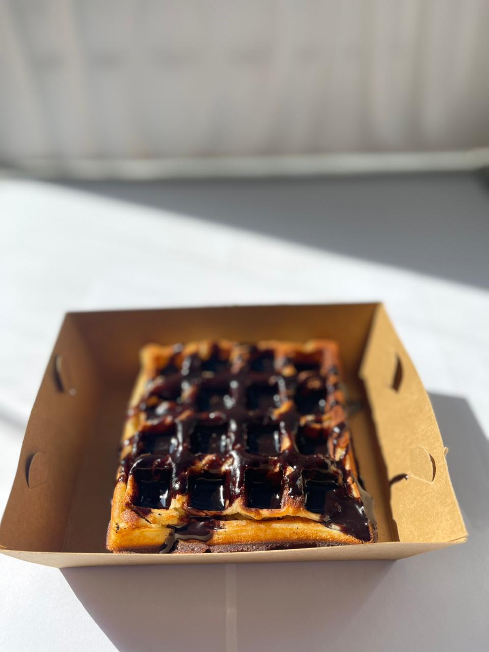 Waffle with Chocolate Drizzle and fior di latte Gelato