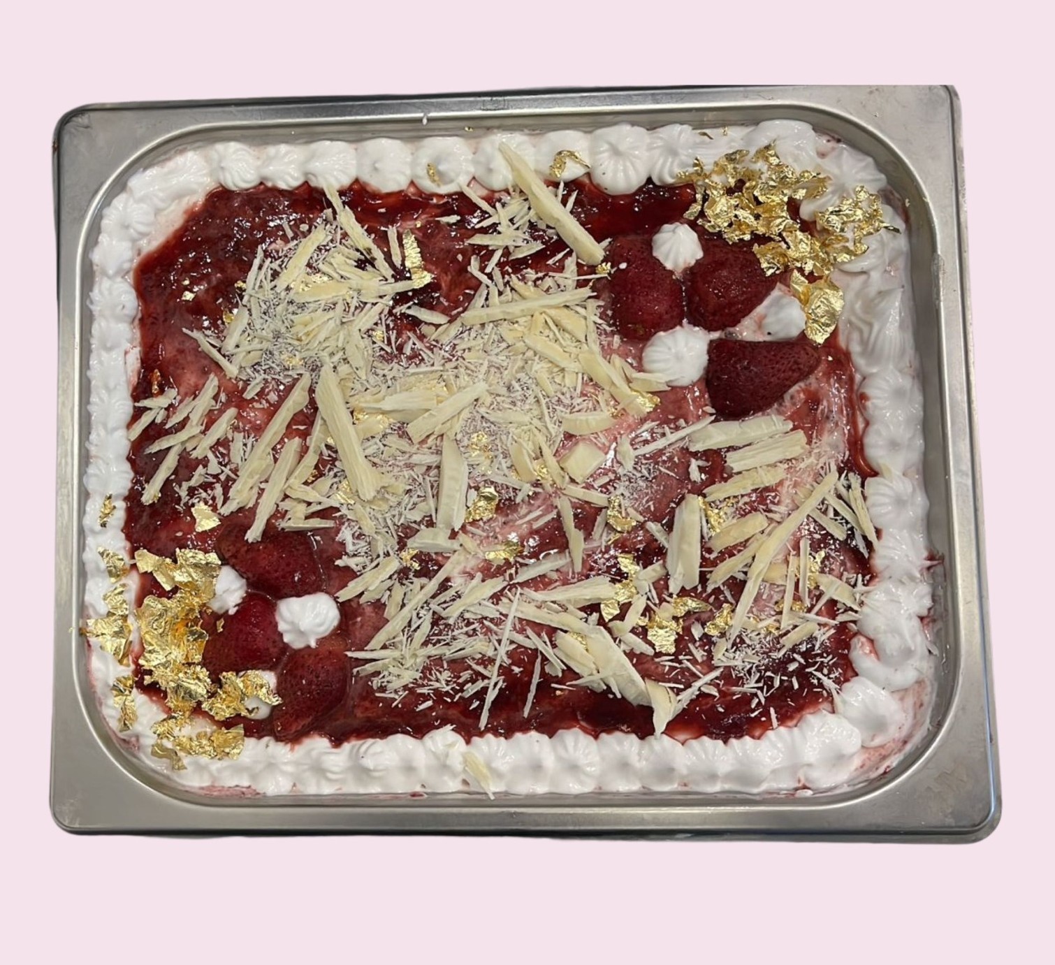 Layers of Vanilla Sponge cake, Crème Chantilly, Fior di latte Gelato, Strawberries and a touch of gold leave all topped with slivered white chocolate